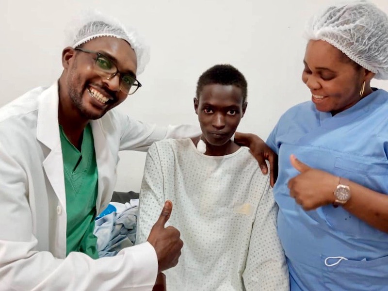..... About the successful operation! Dr Charles Mvondo and his team successfully operated on Ibrahim in October 2023. Ibrahim was cared for by a highly professional team. Here we see Ibrahim with Hilary (anaesthesia nurse Msc) and Elizabeth (graduate nurse) in whose care Ibrahim was able to recover well from the operation.
