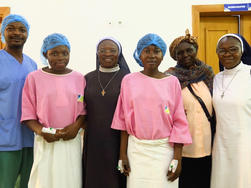 Gaelle Vi ringrazia di tutto cuore per lo straordinario aiuto che le è stato dato. Qui la vediamo (a destra nella foto) con un altro paziente, Susi e i visitatori durante la prima passeggiata dopo l'operazione.