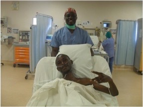 Hervé può nuovamente dedicarsi completamente ai suoi studi! Il 9 settembre 2015 il dottor Charles Mvondo e il suo team hanno inserito con successo una nuova valvola mitralica. Come si può vedere nella foto, Hervé è soddisfatto per la "vittoria". L'ulteriore permanenza nel Cardiac Centre è proseguito senza complicazioni, cosicchè Hervé ha potuto tornare a casa in buone condizioni.
