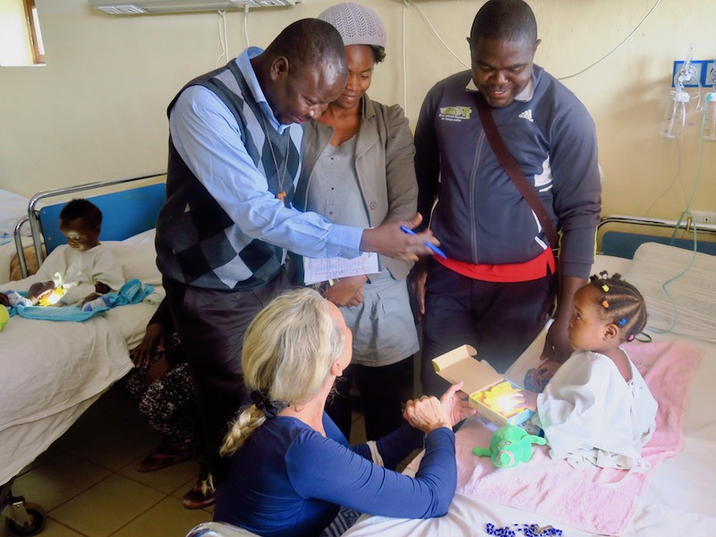 Siamo felici insieme a Marie-Beatrice e ai suoi genitori che la chirurgia cardiaca sia andata bene. Una squadra di medici ospiti dall'Italia ha assistito il dott. Charles Mvondo durante la procedura. Inoltre, la permanenza nell'unità di terapia intensiva è passata senza complicazioni. Marie-Beatrice ha reagito molto bene al trattamento. Giocare con ogni sorta di nuovi giochini le ha reso più facile il tempo trascorso in ospedale.