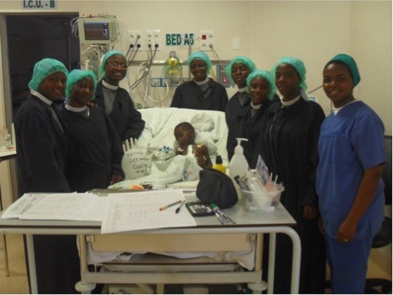 Vediamo qui Renata circondata dalle Suore Terziarie venute a pregare per il recupero della piccola paziente. Per la bambina è stato il secondo intervento chirurgico al cuore.